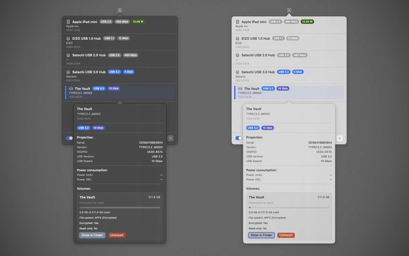 Bring clarity to your USB connections directly in the macOS menu bar. Instantly identify devices, inspect negotiated link speeds and power delivery, assign your own names for easier recognition, and safely eject volumes with precision.